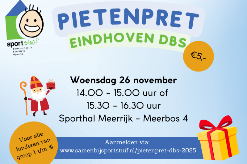 On Wednesday, November 26, 2025, we're hosting a Pietenpret event at the Meerrijk Sports Hall (the Hangar)! You can register for the 2:00-3:00 PM or 3:30-4:30 PM time slots. Registration starts at 1:45 PM and 3:15 PM, and you can register your child upon arrival. The Pietenpret event is for children aged 4 to 8 (group 1 through 4) from Meerhoven and the surrounding area.